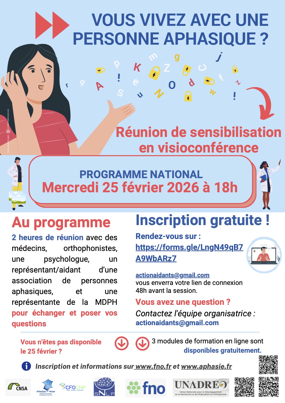 6 sessions de sensibilisation pour les aidants, en visoconférence dans toute la France, en distanciel au niveau national, également ouvertes aux personnes aphasiques et à un large public. L’accès est gratuit mais l’inscription est obligatoire.